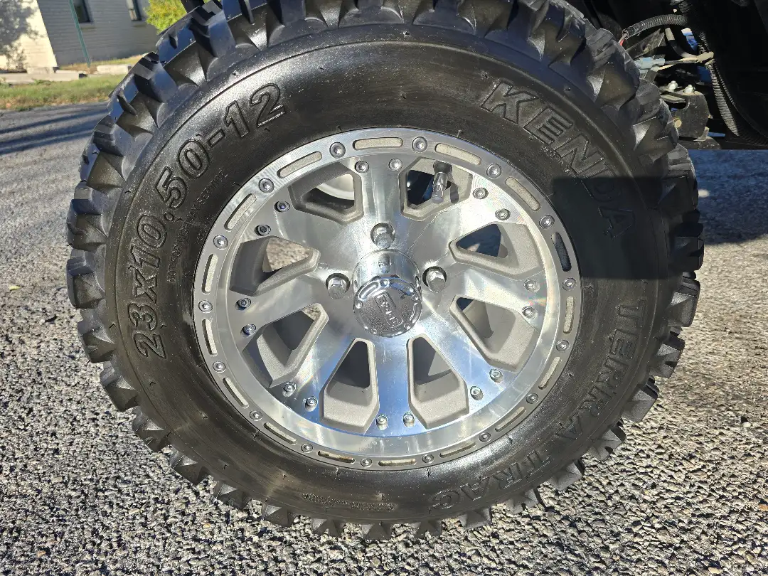 The 2016 E-Z-GO Express L6 is a gas-powered golf cart built for performance and passenger capacity, featuring a strong 13.5 hp engine and seating for up to 6 passengers. This cart is lifted and equipped with custom wheels and tires, giving it an aggressive stance and improved ground clearance.